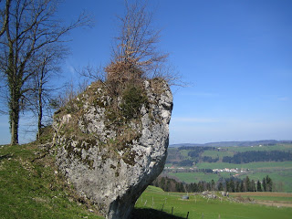 Von Le Bémont bin ich weiter nach La Cibourg. Es war ein wunderschöner Frühlingstag und ich habe zum ersten Mal so richtig Sonnencrème gebraucht. Auch hatte ich zum ersten Mal richtige Glücksgefühle unterweg zu sein. Ich kriege dann am ganzen Körper eine Hühnerhaut und eine tiefe Freude steigt in mir auf. Es war auch eine wunderschöne Wanderung über Weiden, Wiesen und lichte Wälder. Aber wie das halt so ist hält diese Freude auch nicht ewig und später wurde es mir dann zum ersten Mal mulmig als ich zwischen den Kühen hindurch musste. Da habe ich nämlich immer Angst und wenn ich es irgendwie vermeiden kann dann mache ich das auch. Dieses Mal bin ich am elektrischen Zaun aussen rum bis kurz vor dem Gatter und habe mich dann unter dem elektrischen Zaun mit meinem Rucksack unten durch gezwängt. Dann bin ich schnell zum Tor und raus. Puuuhhhhh, nochmal davon gekommen. Es ist ja nicht so, dass Kühe generell aggressiv sind aber ich habe es einmal erlebt als ich mit Willi unterwegs war und wir über den Stachelzaun flüchten mussten. Willi hat sich dann noch die Hose zerissen.