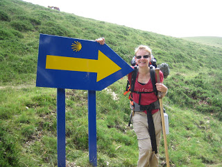 Ich habe die Pyrenäen überquert! Wir sind am Morgen früh, es war noch dunkel, bei Nebel und Nieselregen gestartet. Wir waren zügig unterwegs, bei diesem Wetter kam es einem ja auch nicht in den Sinn zu schlendern, und nach ca. 1.5 Std. waren wir schon in Orisson wo wir uns eine Kaffeepause gegönnt haben. Die ersten 7 – 8 km bis Orisson sollen ja die steilsten sein auf dem ganzen Weg aber wir sind da leicht und locker hoch gelaufen. In Orisson hat sich Ashley noch angeschlossen eine Bekannte von Bridget und so waren wir dann zu viert unterwegs. Gesehen haben wir nicht viel, da es total neblig war. Als wir schon fast oben auf dem Pass waren ist der Himmel plötzlich aufgerissen und wir durften das wunderschöne Panorama bewundern. Plötzlich haben wir Geier gesehen, Schafe und wilde Pferde. Es war einfach toll und wir waren in euphorischer Stimmung. Roger hat sich dann mal ins Gras gelegt und wollte die Geier testen indem er sich tot gestellt hat aber sie haben ganz in Ruhe weiter ihre Kreise gezogen und darauf gewartet dass einer von uns das zeitliche segnet. Was Gott sei Dank nicht passiert ist. Dann hat man schon wieder gesehen wie der Nebel hoch kommt und es ging nicht lange da war es schon wieder vorbei mit der Sicht. Bei der Rolandsquelle haben wir Pause gemacht und von dem berühmten Nass getrunken. Ein Spanier war auch da und den haben wir gleich mal mit einem „Hola, que tal“ begrüsst. Er hat uns nur angegrinst und ist dann weitergelaufen. Das erste was uns in Spanien aufgefallen ist, waren die riesigen blau/gelben Pfeile für den Camino. Wir haben uns gekrümelt vor Lachen, die sieht sogar ein Blinder und bei dickstem Nebel. Da kann ja nichts mehr schief gehen…;-).