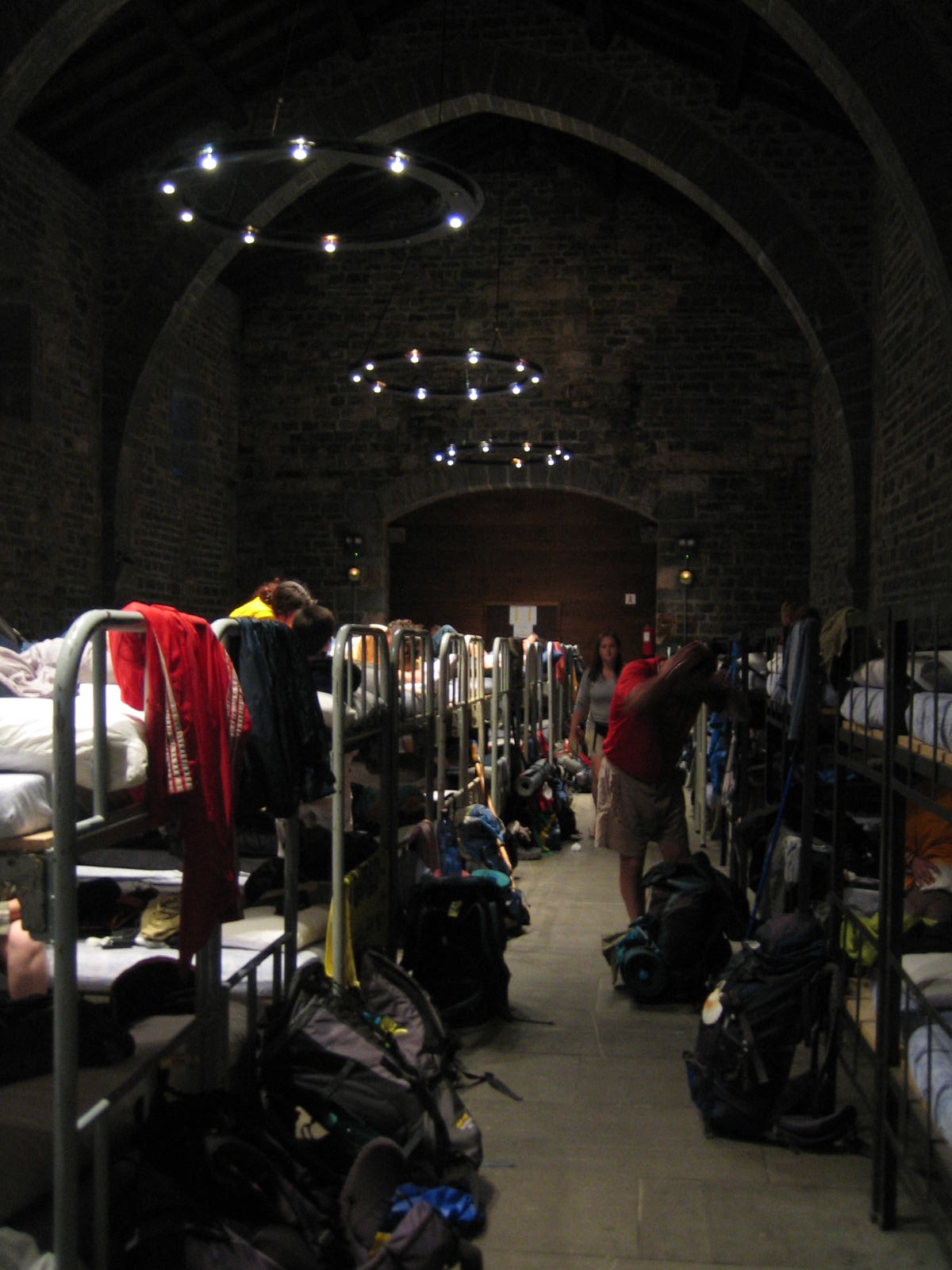 Der grösste Unterschied zu Frankreich sind die Massen von Pilgern und die riesigen Schlafsäle. Werde wohl einige Tage brauchen um mich daran zu gewöhnen. Trotz der vielen Pilger ist die Herberge gut geführt von Holländern und man kann sogar seine Kleider waschen und trocknen lassen da es nicht viel Platz gibt um sie aufzuhängen. Überhaupt hört man viel negatives über diese Herberge was ich nicht bestätigen kann (vor allem wenn man das Buch von Hape gelesen hat). Draussen regnet es in Strömen und da ich meine Regenjacke und Turnschuhe zurückgeschickt habe, habe ich jetzt nur noch die Pellerine und die Sandalen. Ich bin in der Frühschicht zum Essen dran und bin froh, dass ich nicht mehr all zu lange warten muss. Um 10.00 Uhr ist dann Lichterlöschen, im Wahrsten Sinne des Wortes gehen dann die Lichter aus. Um 6.00 Uhr gehen sie dann wieder an und wir werden mal wieder ohne Frühstück (ich nehme an in Spanien wird das jetzt immer so sein) bis Burguete laufen und da gibt es dann das erste spanische Frühstück. Bocadillo con jamon, übe schon mal ein bisschen für Morgen…;-).