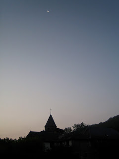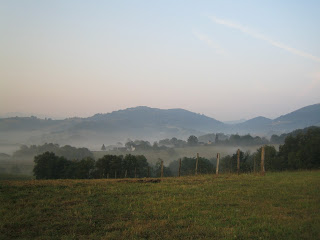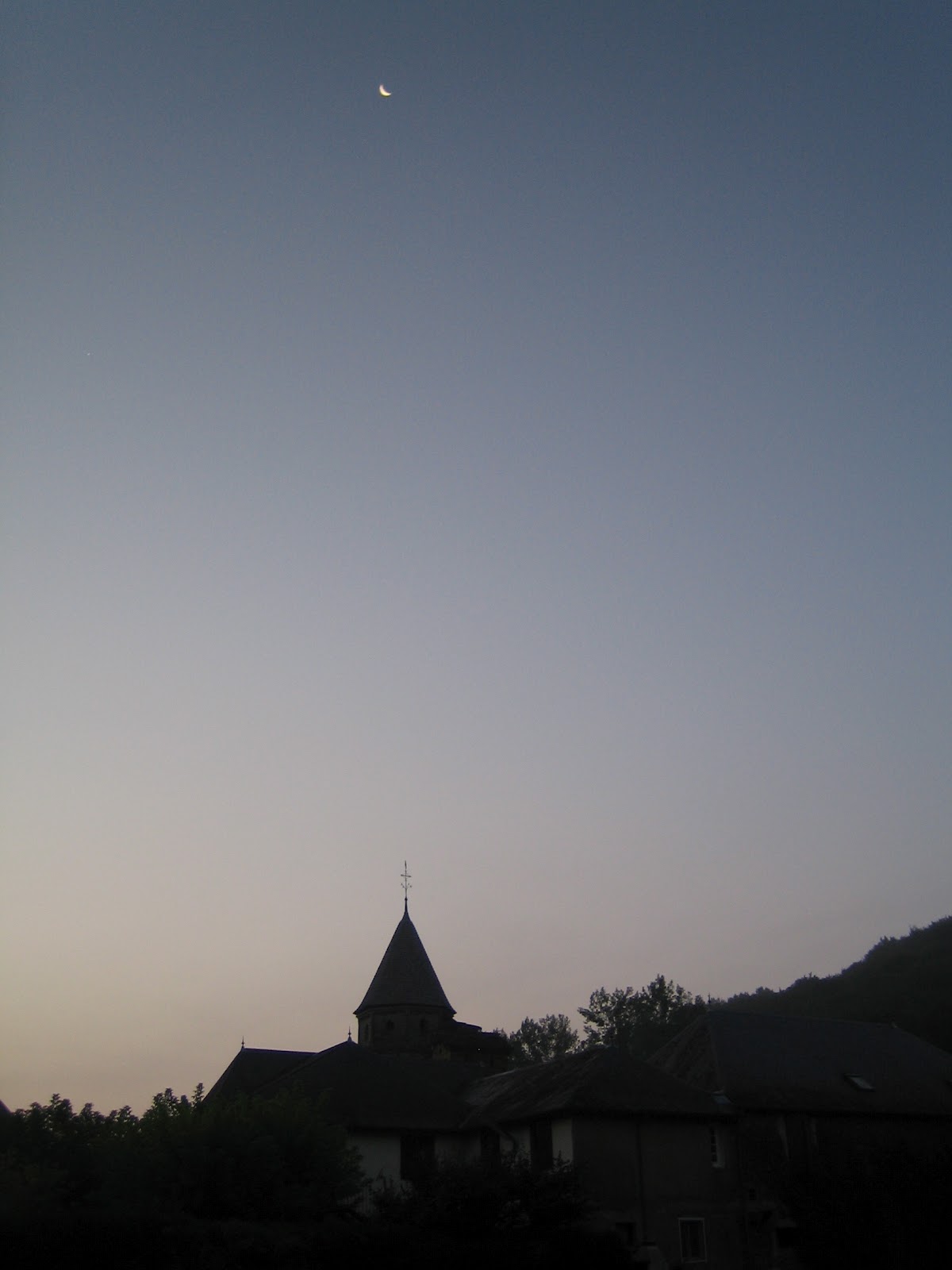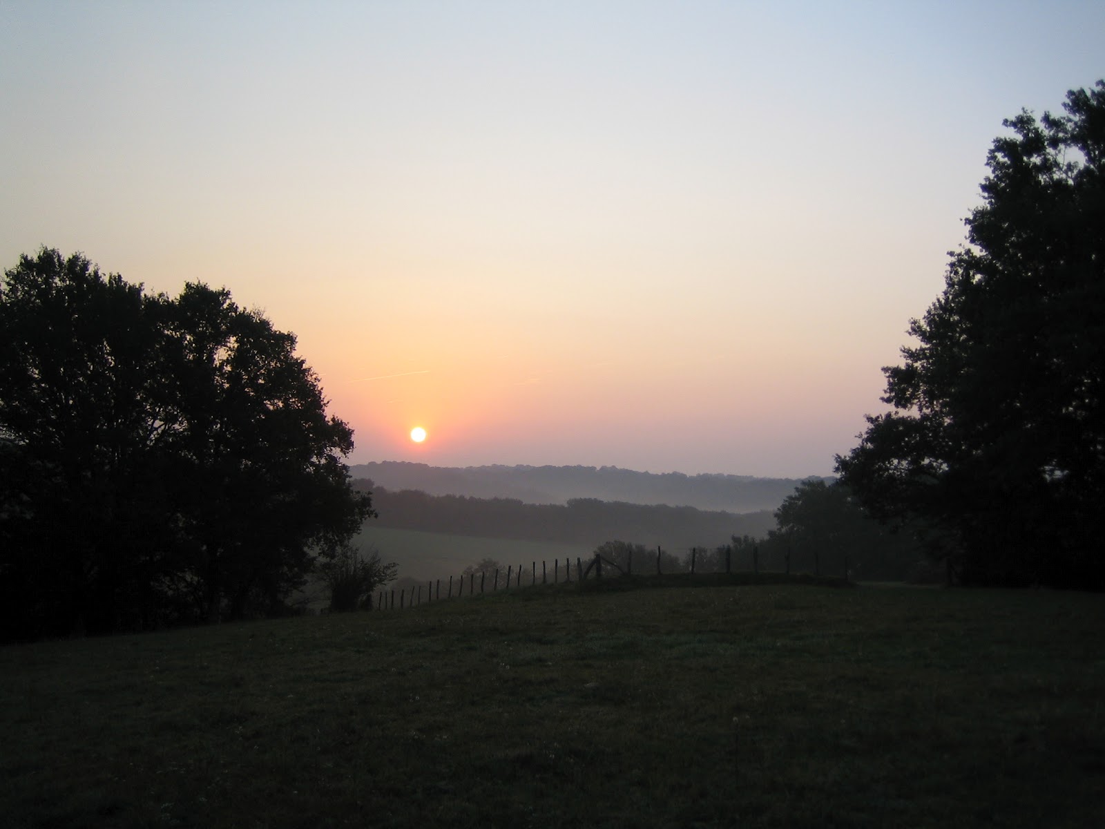 Habe heute Nacht seit langem wieder einmal gut geschlafen. Vielleicht lag es an den Ohrstöpseln, die ich vorsichtshalber rein gemacht habe, da Gérard gemäß Ehefrau schnarchen soll oder lag es daran, dass ich nicht alleine im Zimmer war? Keine Ahnung. Um 7.20 stand ich schon wieder auf der Piste bereit zum Abmarsch. Keine Spur mehr von den dunkeln Wolken, die gestern meinen Geist umwölkt haben. Ich fühlte mich frisch, nichts schmerzte mehr und ich wusste, dass dies ein sehr guter Tag werden würde. Es war sehr frisch und die Sonne noch nicht aufgegangen. Bin dann zügig los, der Weg verlief steil hoch in den Wald. Im Wald früh morgens vor Sonnenaufgang ist es noch sehr dunkel. Ich habe aber die Wegmarkierungen gut gesehen und somit war es kein Problem. Da fragt sich bestimmt der eine oder andere von euch ob ich keine Angst hatte? Die Antwort ist Nein. Der Verstand meldet sich zwar, dass ich Angst haben sollte aber wenn ich den Wald einfach spüre und im Moment bin habe ich keine Angst. Der Wald hat absolut nichts beängstigendes. Ab und zu wenn man nicht zuviel Lärm macht und der Wind aus der richtigen Richtung kommt, sieht man sogar Rehe. Sie verharren dann und starren einem an und wenn man nur eine kleine Bewegung macht, z.B. weil man fotogafieren möchte, verschwinden sie ganz schnell. Ansonsten sieht man nicht viele Tiere, nur Vögel die davon fliegen.