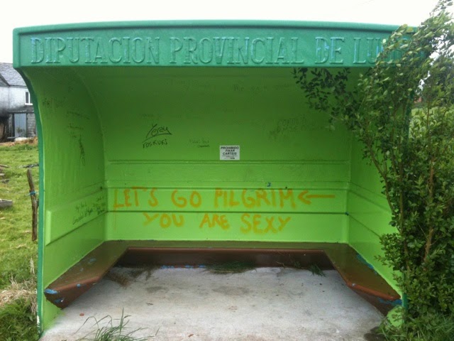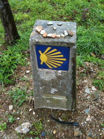 Dieser kleine Unterstand hätte mich fast mein Leben gekostet. Ich wollte mich da einen Moment ausruhen. Da es durch den Wind so laut war, habe ich nicht gehört, dass von hinten ein Auto kommt. Gerade als ich rüberziehen will, braust das Auto an mir vorbei. Uff!!! Scheinbar nicht mein Tag zu sterben… Hurra, ich lebe noch! Noch nicht das Ende der Erfahrung… Man sieht ja oft Erinnerungstafeln von Pilgern die auf dem Weg gestorben sind. Es erinnert einem immer daran, dass es nicht selbstverständlich ist, dass man in Santiago ankommt.