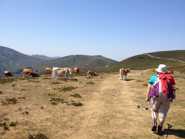 Sie sind dann die längste Zeit einfach nicht weitergelaufen. Dann kam noch Andrea, eine Pulgerin aus Deutschland und stand wie angewurzelt an der Seite des Weges. Mein Fluchtweg war natürlich abgeschnitten weil die Kühe davor standen. Habe dann geschrien, dass sie sich endlich weiter bewegen sollen uns siehe da sie hatten ein Einsehen und trotteten weiter. Die Kühe hier haben nicht einfach Stummel auf dem Kopf sondern richtige, spitze Hörner! Ganz schön Angst einflößend. Andrea und ich sind dann fast den ganzen Weg mehr oder weniger zusammen gelaufen und abends haben wir auch zusammen gegessen. War schön mal wieder Gesellschaft zu haben.