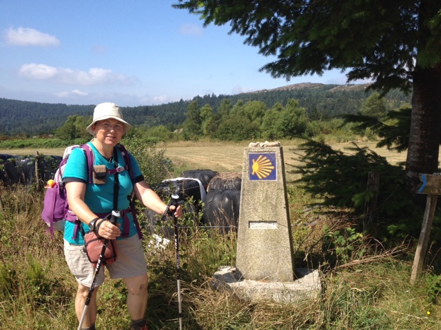 Andrea beim ersten Wegzeichen in Galicien. Die Muschel zeigt in Galicien in die andere Richtung und man muss aufpassen, dass man sich nicht verläuft.
