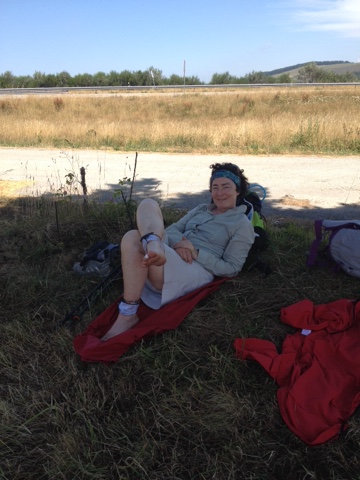 Morgens gehe ich meistens alleine los und genieße die Stille, das Vogelgezwitscher und früh unterwegs zu sein. Nach 2 Std. mache ich meine erste Pause und dann holt Andrea mich meistens ein. Von da an laufen wir meistens zusammen wobei ich nachmittags langsamer werde und oft auch alleine ankomme. Diese Mischung ist aber perfekt. Denn ich könnte nicht die ganze Zeit zu zweit unterwegs sein.