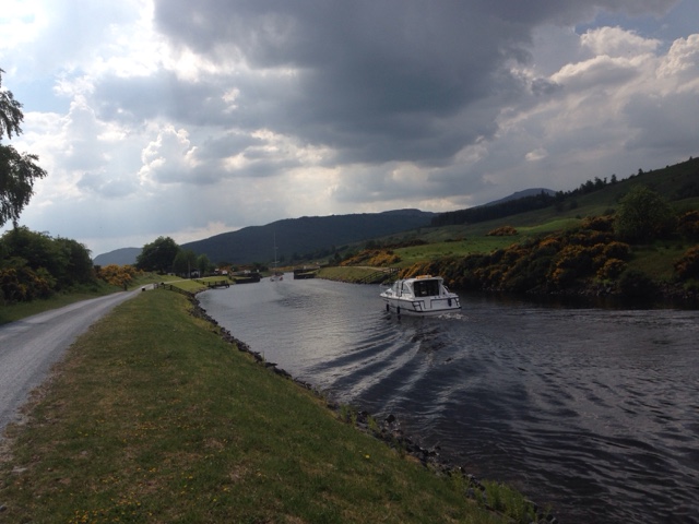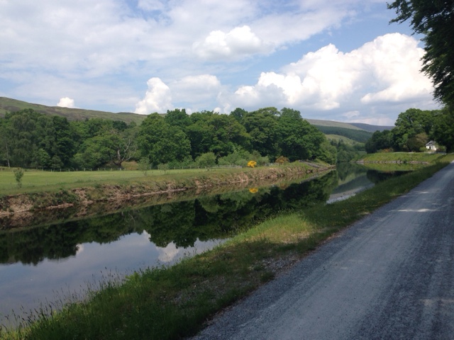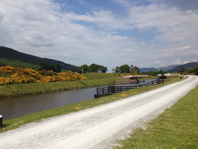 Es ging heute den ganzen Tag einem Kanal entlang, was eigentlich ganz schön war nur mit der Zeit wurde es langweilig. Keine Abwechslung, immer das Gleiche. Kein Vergleich mit dem West Highlandway, der war keinen einzigen Tag langweilig. Dazu war es heiß und schwül und es viel mir ganz schön schwer, den Tritt nach dem Ruhetag wieder zu finden. Auch fühlte sich der Rucksack schwer an, da ich Proviant für 2 – 3 Tage mitschleppen muss. Wasser gab es am WHW ohne Ende, man konnte das Wasser meist direkt aus dem Bach trinken ohne es behandeln zu müssen. Hier würde ich das Wasser aus dem Kanal nicht mal trinken wenn es gefiltert und chemisch behandelt wäre. Ich habe eigentlich immer nur einen Liter dabei, bei dieser Hitze und keiner Möglichkeit nachzufüllen viel zu wenig. Je nach Wetter morgen muss ich wohl zusätzlich zu meinen beiden Halbliterflaschen noch die Trinkblase halb füllen, damit ich 2lt habe.