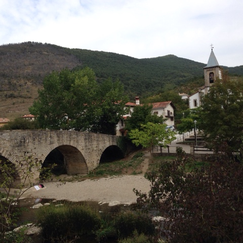Der Tag heute war schwer weil ich soviel auf der Strasse laufen musste, da könnte ich mir das Pilgern glatt abgewöhnen. Es gab aber auch viele schöne Abschnitte wo ich mich wieder erholen konnte. Heute gab es 18km keine Bar, das war von 8.00 bis ca. 14.00h um euch eine Vorstellung zu geben. Als ich dann in Sorauren von der anderen Flussseite ein Restaurant sah habe ich mich sogleich über die mittelalterliche Brücke gestürzt und mich auf die Terasse gesetzt.