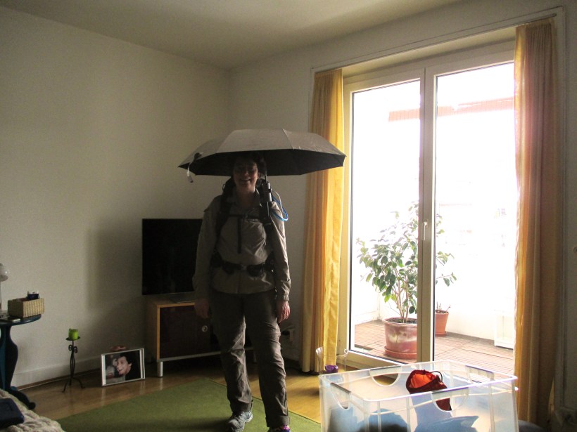 Den heutigen Nachmittag habe ich damit verbracht, herauszufinden wie ich meinen reflektierenden Schirm für die Wüste an meinem Rucksack befestigen kann. Ist gar nicht so einfach und Gott sei Dank findet man ja im Internet immer wieder hilfreiche Tipps dazu. Ich habe schallend gelacht, als ich mich im Spiegel gesehen habe und fand dies muss ich unbedingt mit euch allen teilen. Das Bild ist leider etwas Dunkel geworden aber man kriegt einen Eindruck….