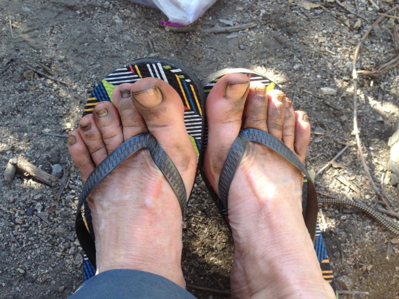 Es war wieder sehr heiss und ich lief meistens vorne weg. Gegen Mittag kamen wir zu einer kleinen Quelle die direkt aus der Wand kam. Dahinter gab es etwas Schatten den Weg entlang. Genau da haben wir unsere Siesta abgehalten. Die anderen Hiker mussten über uns drüber steigen und haben sich gleich hinten angehängt. Schatten war Mangelware heute und man müsste nehmen was sich anbietet. Ich habe sogar ein kurzes Nickerchen gemacht und dabei übersehen, dass es an der Wand Poison Oak hatte. Dies ist eine fiese Pflanze, die Ausschläge und Blasen macht. Jetzt habe ich rund um den  Bauchnabel einen Ausschlag und 2 kleine Blasen die jucken und eine weitere Stelle am Mittelfinger. Könnte schlimmer sein…