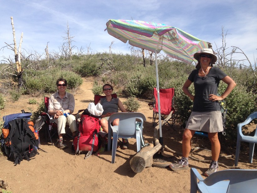 Wir hatten nicht mit der Sonne gerechnet! Um 6.30 war an Schlaf nicht mehr zu denken. Es wurde bereits heiss, deshalb hieß es nach 5 Stunden Schlaf bereits wieder aufstehen. Hungry-G ging als erste los, sie wollte aus der Sonne raus und im Schatten frühstücken. Nach einer Meile kamen wir zu der Campsite wo es Trail Magic gab. Es gab Wasser und Fruchtsäfte. Der Watercache war mit Campingstühlen ausgestattet und so konnten wir uns ganz zivilisiert hinsetzen und frühstücken. Reneé war auch hier, eine Amerikanerin mit französischem Namen. Wir beschlossen bereits bei Meile 558 den Trail zu verlassen, da man von da aus besser nach Tehachapi hitchen kann als Meile 566 wo es einen Highway gibt, der sich schlecht zum hitchen eignet. Zudem wollte ich es unbedingt am Samstagnachmittag nach Tehachapi schaffen, da Mermaid für 2 Nächte ein Hotel reserviert hat.