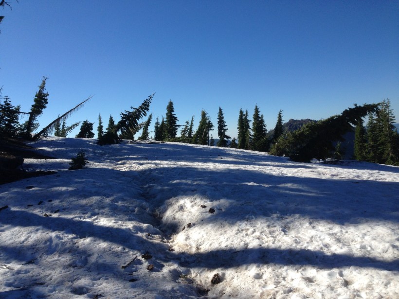 D-Hiker und ich sind um 6.30 los heute Morgen. Extra nicht zu früh, damit der Schnee mich zu hart oder sogar gefroren ist. Es waren nur noch 2 Meilen bis zum Dicks Pass. Ca. 1 Meile vorher begann es mit den Schneefeldern. Teilweise konnten wir sie ohne Spikes überschreiten. Sobald es steiler wurde haben wir sie aber abgezogen. Man kann damit einfach  besser laufen auf dem Schnee. Wir mussten teilweise auch um Schneefelder rumklettern. Dabei bemerkte ich wie stark meine Füße und Beine mittlerweile geworden sind. Das sind teilweise echt steile Hänge. Wir fanden den Weg mit dem GPS problemlos. Manchmal haben wir die Serpentinen einfach ausgelassen und sind gerade den Berg hochgeklettert. Wenn es Schnee hat nimmt man es nicht mehr so genau damit jede PCT Meile zu laufen. Es geht einfach darum hoch oder runter zu kommen und den Trail wieder zu finden.