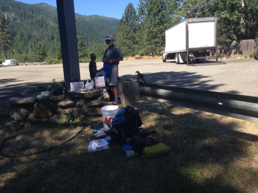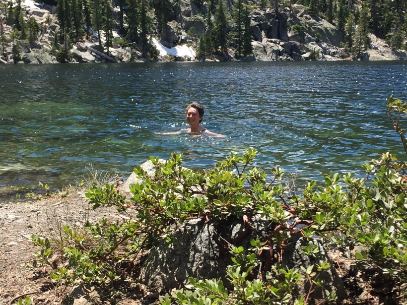 Ich bin um 13.30 angekommen, D-Hiker und Big Sky waren schon seit 11.45 dort (die Angeber😉). Habe mich auch nicht sehr beeilt. Ich habe zuerst mein Zelt aufgebaut und dann bin ich im See schwimmen gegangen, in meiner schicken schwarzen Hikerunterwäsche😂. D-Hiker hat ein Foto von mir gemacht und da sehe ich richtig dünn aus. Schätze das ich noch 52kg wiege. In letzter Zeit habe ich aber nicht mehr abgenommen, ich esse auch mehr als vorher. Morgens nach dem Aufstehen gibt es einen Energieriegel und einen Kaffee. Nach ca. 1-1.5 Std. gibt es Frühstück mit Oatmeal (Haferflocken) und Kaffee. Zweite Pause am Morgen eine Tortilla und Thunfisch. Zum Mittagessen Ramen (Suppe mit Nudeln). Am Nachmittag einen Energieriegel und abends Pasta, Reis oder Cous Cous. Wenn ich einen besonders harten Tag hatte gibt es vor dem Zubettgehen noch eine heisse Schokolade😋.
