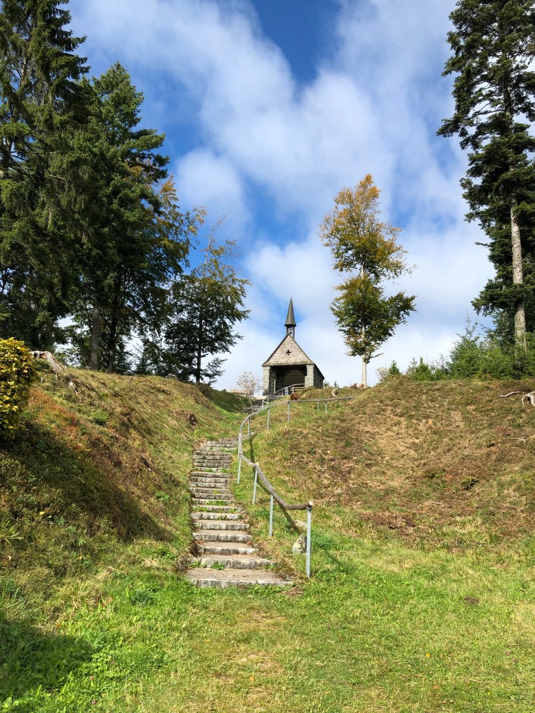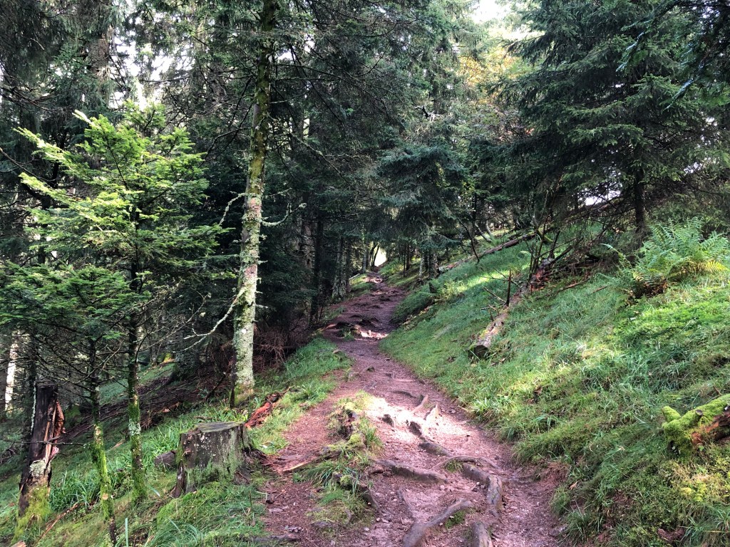 Oben angekommen ging ich ins Restaurant und aß Kaffee und Kuchen. Das Wetter schien sich zu verschlechtern und deshalb machte ich mich bald an den Abstieg. Zuerst nahm ich noch den falschen Weg weil es manchmal einfach schön ist jemandem hinterher zu laufen. Nur war der nette ältere Herr auf dem Belchenweg unterwegs und nicht auf dem Westweg.