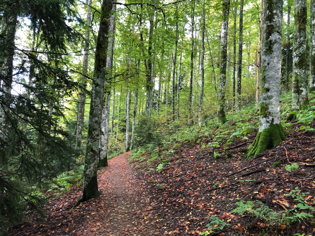 Kaum war ich auf dem richtigen Weg fing es an zu tröpfeln. Ich habe dann schnell meine Regenmontur angezogen und bin zügig weitergelaufen. Gottseidank ging es in den Wald, da ist man gleich etwas geschützter. Der Regen war aber harmlos und bald schon konnte ich die Regenklamotten wieder versorgen.