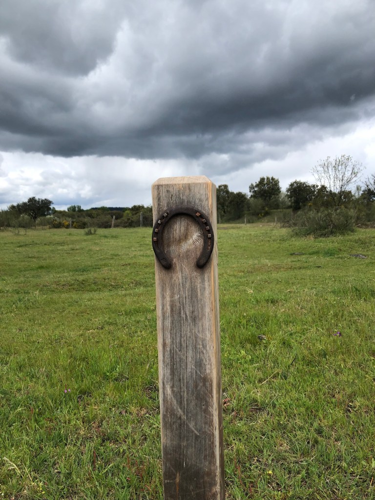 Es hingen drohende schwarze Wolken am Himmel aber die Regenausrüstung hatte ich beim Arco bereits wieder abgezogen. Es schien auch immer wieder die Sonne. Bei einem Granitpoller, damit kennzeichnen sie den Weg zusätzlich und sie eignen sich ausgezeichnet als Sitzmöglichkeit, versuchte ich nochmals Pause zu machen und mein abgebrochenes Mittagessen fortzusetzen. Mittlerweile war es fast 14.00h. Kaum saß ich fing es wieder an zu tröpfeln. Du nervst rief ich gegen Himmel😡. Mir gegenüber war ein Hufeisen an einem Pfahl befestigt, na ja viel Glück scheinte ich im Moment nicht zu haben. Auf jeden Fall nicht mit meinen Pausen.