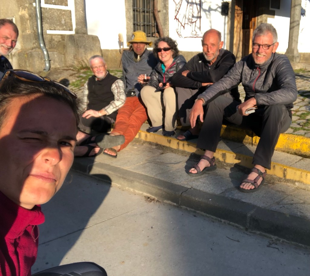 Hier gibt es eine kirchliche Herberge und die ist ziemlich berühmt auf der Via de la Plata auch wegen dem Pfarrer Don Blas. Normalerweise kocht und isst man hier zusammen aber da es immer noch Covid gibt, findet das im Moment nicht statt. Wir bekamen aber trotzdem eine Suppe und Empanada. Anna machte noch ein riesigen Salat und wir aßen alle aus der selben Schüssel. Covidtechnisch nicht so ideal😬. Bill hatte noch eine Flasche Wein gekauft und so saßen wir alle draußen und froren uns den Hintern weg im Moment wo die Sonne unterging.
