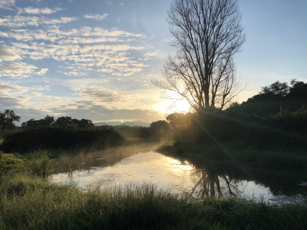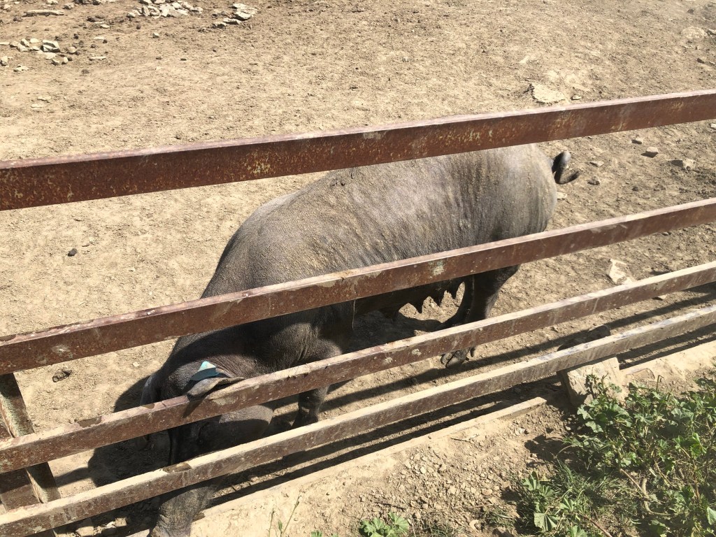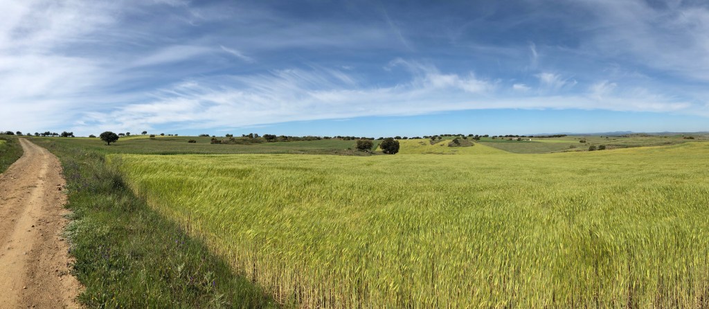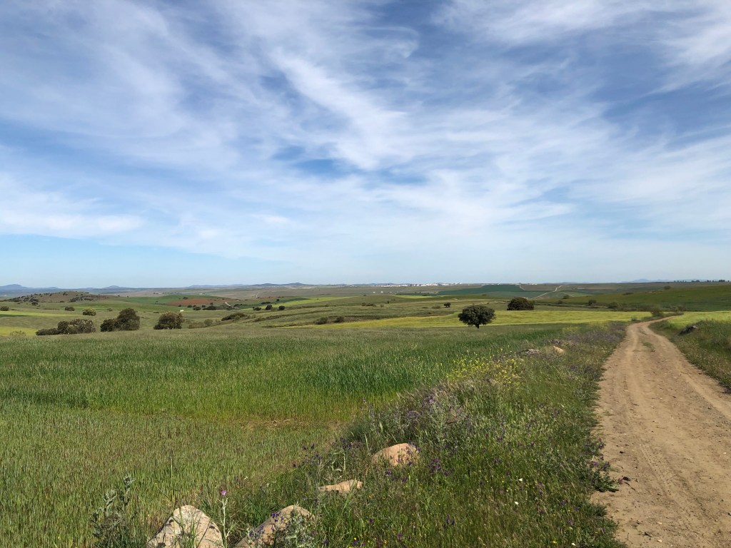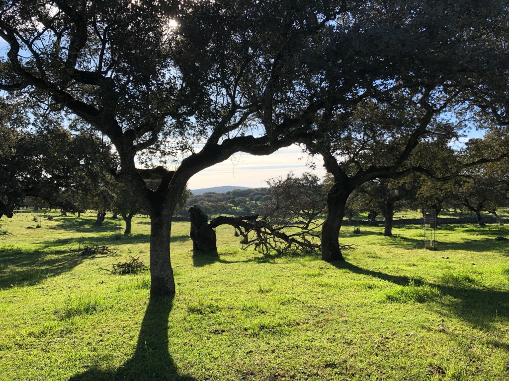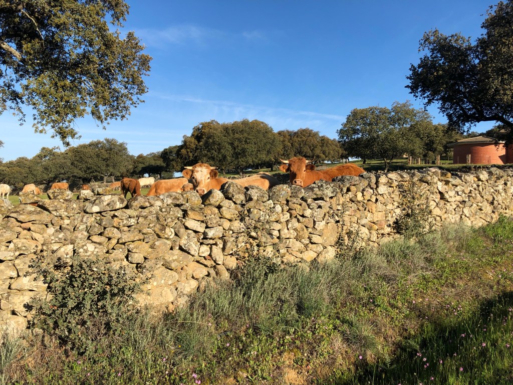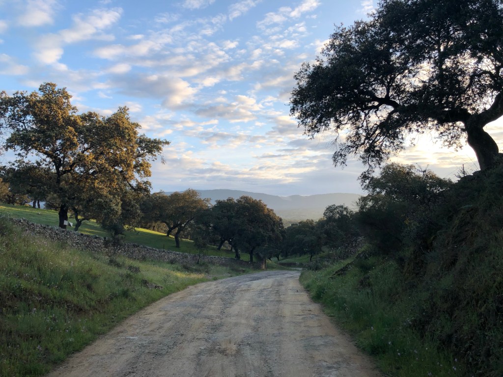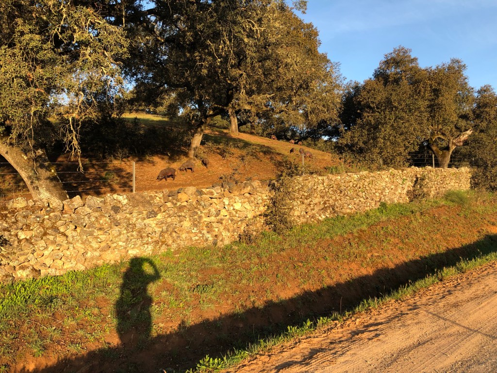 Anfangs ging es noch durch schöne Dehesas mit vielen Korkeichen und Kühen, Schafen und schwarzen Schweinen die darunter grasten. Man merkte aber langsam, dass die Bäume immer weniger wurden.