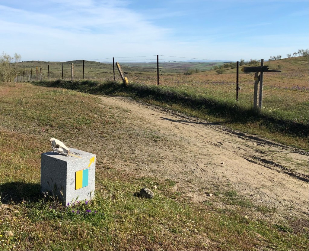 Ich passierte ein Tor wo ein Granitstein stand und darauf ein Schädel. Keine Ahnung was für einer. Für eine Kuh aber wohl zu klein. Ich sah weiter oben einen weiteren Granitstein mit den Farben gelb und grün und dachte dass der Weg dort oben weiterging. War schon etwas komisch, dass ich du die Pampa laufen musste um dorthin zu gelangen. Ich übersah etwa drei gelbe Pfeile (siehe Bild). Ich lief frisch fröhlich in die falsche Richtung. Na ja irgendwann habe ich dann mein GPS gecheckt und es gemerkt. Gelb entspricht nicht immer dem gelben Pfeil. Das habe ich jetzt gelernt. Ich lief ein Stück zurück und ging dann quer Feld ein bis zum Camino.