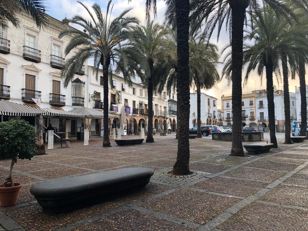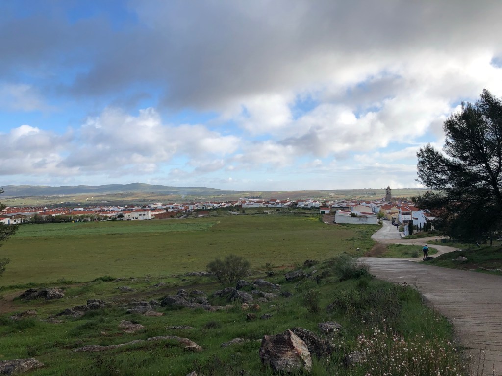 So um 8.50 ging ich los über die Plaza Grande weiter zur wuchtigen Kirche von Zafra. Schnell war ich aus der Stadt und von weitem sah ich einen Pilger. Das konnte nur der English Man Marc sein. Ich erkannte ihn an seinem türkisblauen Rucksack und an seinem etwas speziellen Gang. Ich holte langsam auf und als ich Jean-Pierre am Boden sitzen sah, der mit Marc plauderte, musste ich schmunzeln. Jean-Pierre meinte wir seien die Spätstarter, deshalb treffen wir uns immer.