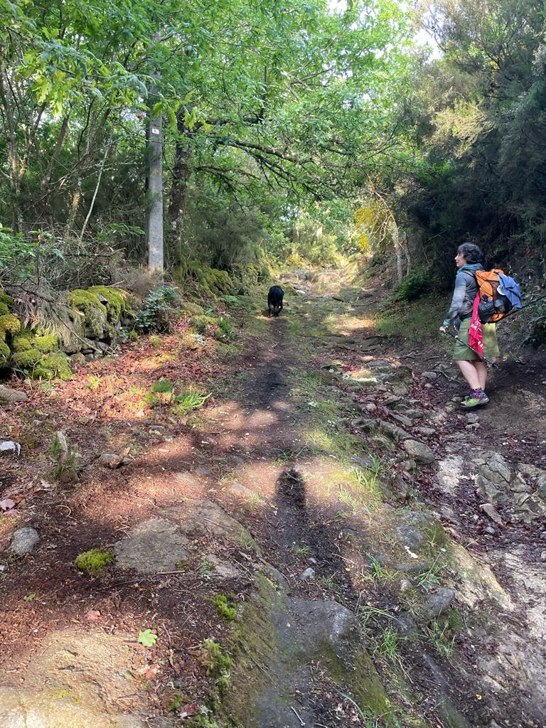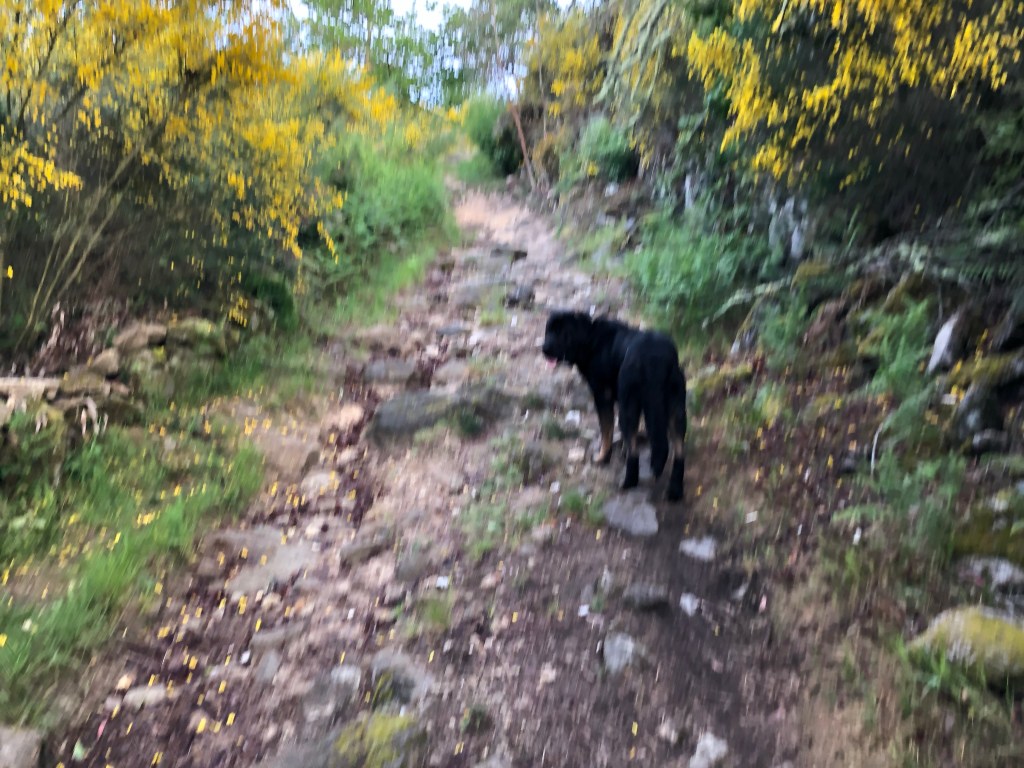 Es ging auf einem steinigen, holprigen Pfad weiter den Berg hinauf. Plötzlich saß da ein großer schwarzer Hund mitten auf dem Weg. Er schien auf uns gewartet zu haben. Er ist mir schon auf dem Klosterhof aufgefallen gestern Abend. Am Anfang lief er vor uns und zeigte uns den Weg oder es kam mir zumindest so vor. Manchmal verschwand er im Gebüsch und tauchte weiter vorne wieder auf. Einmal jagte er irgend ein Tier war aber erfolglos. Er begleitete uns sicher eine Stunde bis wir ins nächste Dorf kamen. Dort kehrte er um und machte sich wohl auf den Rückweg zum Kloster. Das war eine sehr schöne Begegnung.