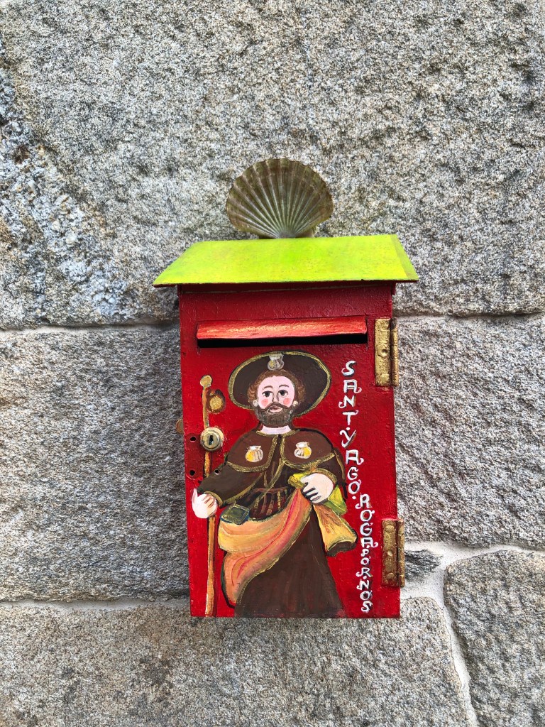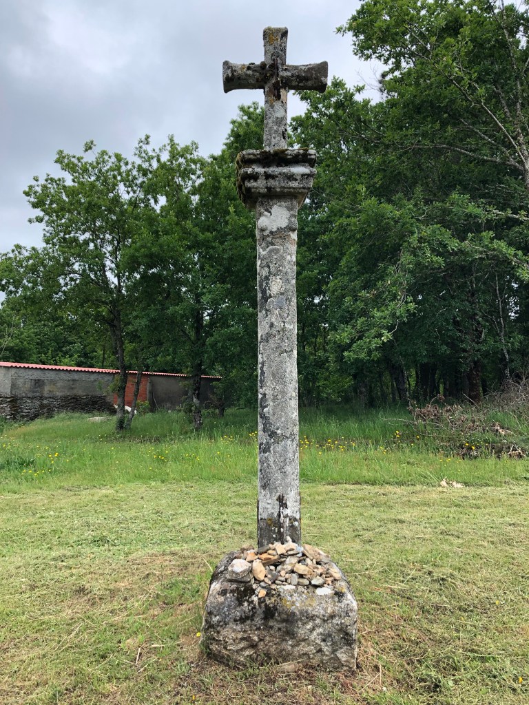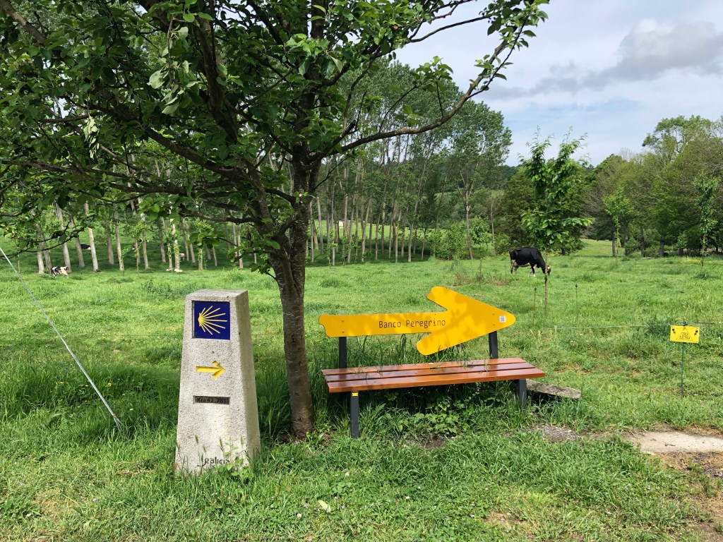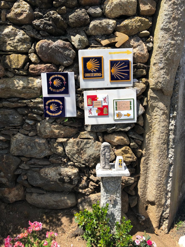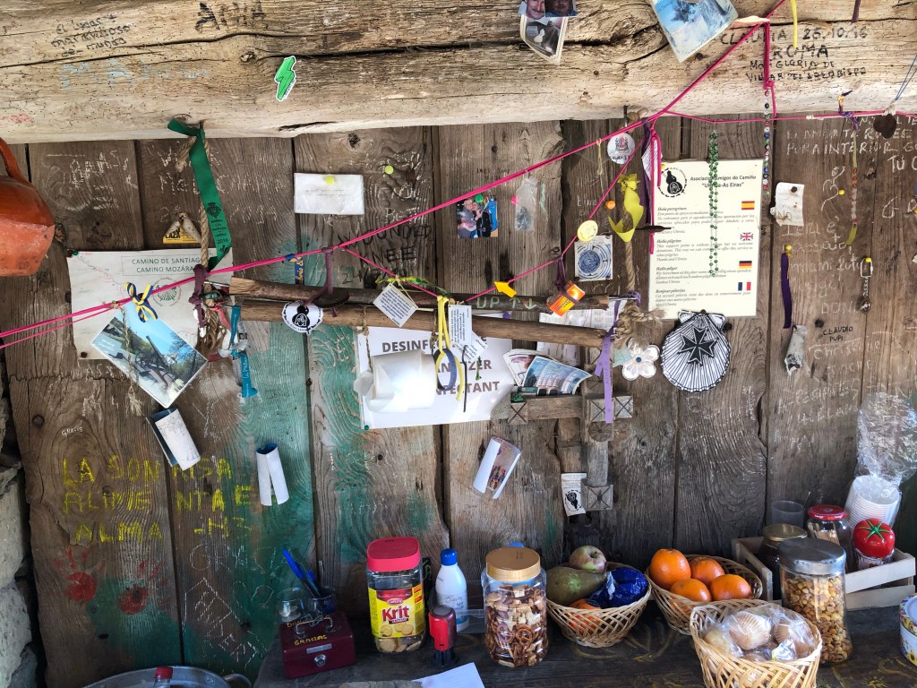 Wir kamen an einem Schrein vorbei wo ein Pilger verstorben ist. Pilger lassen kleine Dinge zurück wie Anhänger, Sticker, kleine Figuren, Muscheln usw. Wir machten dort Pause und assen eine Banane. Es war so friedlich da und man hörte nur die Vögel zwitschern. Wollte gar nicht weitergehen. Grace musst mich antreiben.