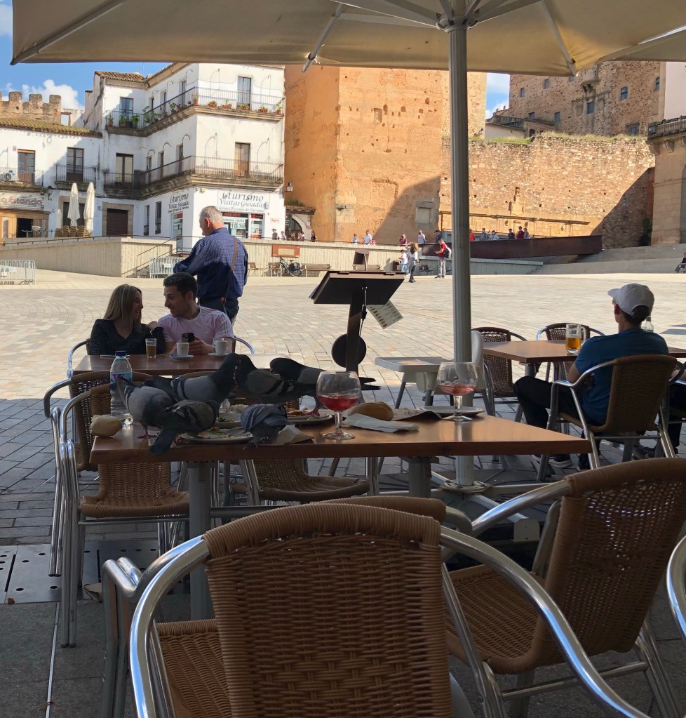 Es war 15.30 und ich hatte ein riesiges Loch im Bauch. In der Extremadura kann man meist bis 16.00 Mittagessen. Meine neue Taktik um nicht bis 20.30 hungern zu müssen😂. Ich kam im Hostal an, bezog mein Zimmer und machte mich schnurstracks auf den Weg ins Restaurant. Der Senor hier hatte mir noch verraten wo man besonders gut isst. Auf dem Weg dorthin traf ich den Kanadier, er kam mit auf ein Bier. In der Bar bestellten wir Bier. Der Senor meinte ich könne aber nur oben im Comedor essen. Ich fragte ob ich das Bier hochnehmen darf.